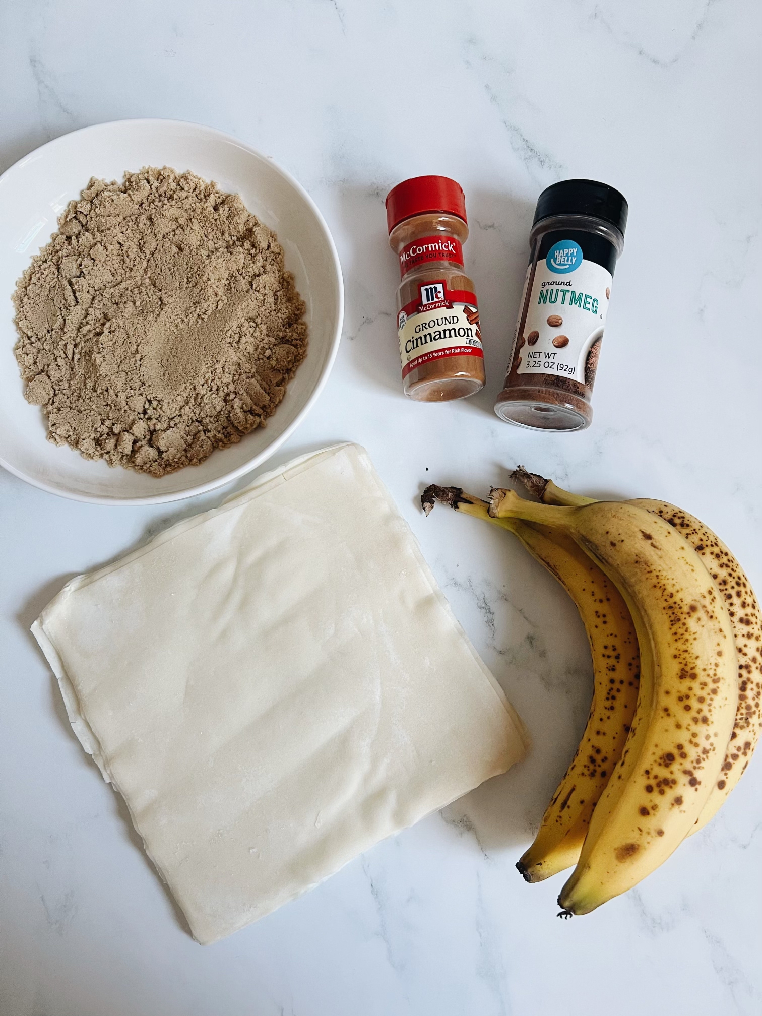 I used regular bananas for this recipe, but it tastes even better with apple bananas or those small sweet ones (though I couldn’t find them in my area). I cut the bananas into quarters first because they were too big to fit onto the wrapper. Then, I mixed brown sugar with a pinch of cinnamon and nutmeg. I coated the cut bananas in the brown sugar and placed them on the egg roll wrapper right away, as the sugar starts to melt into it