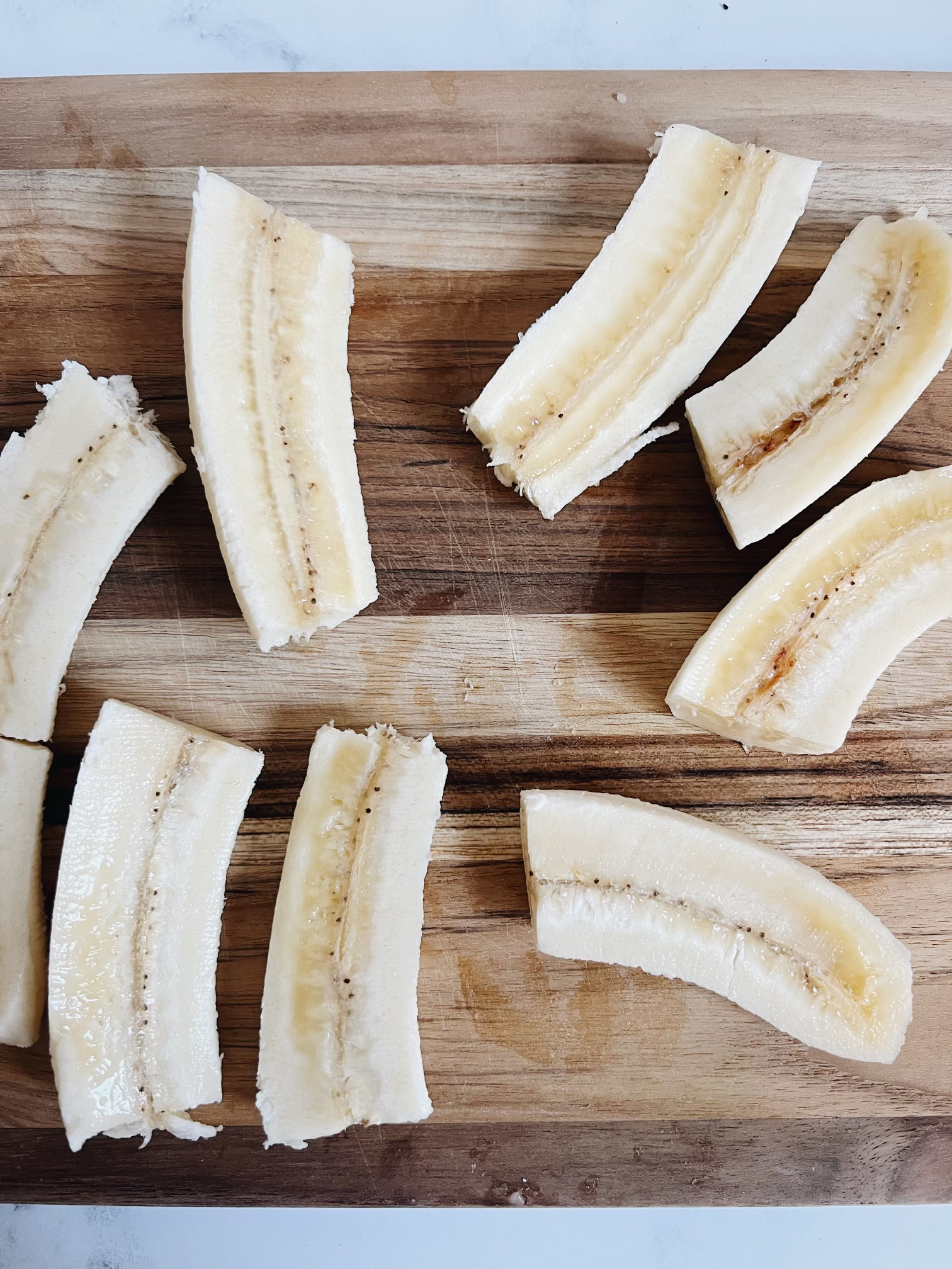 - Start by peeling your bananas and cutting them in half down the middle and cut them in half long ways again so they are lying flat but still long.