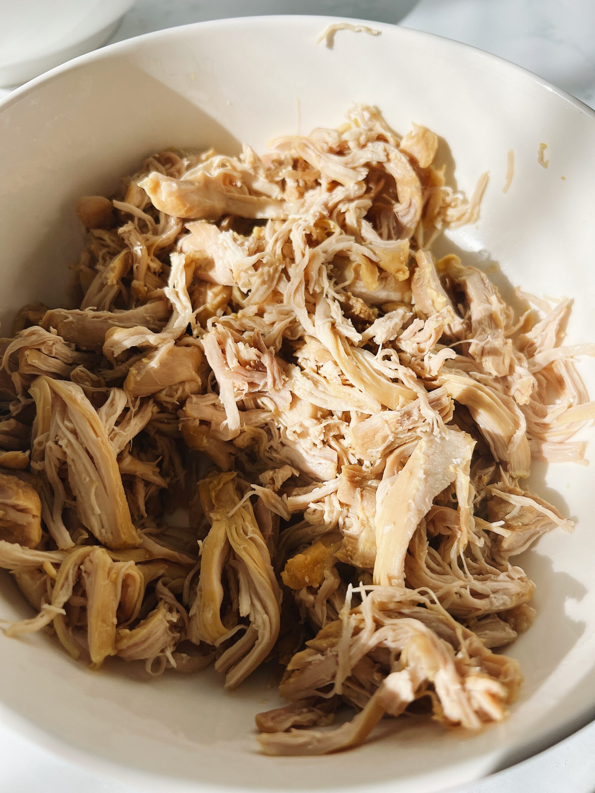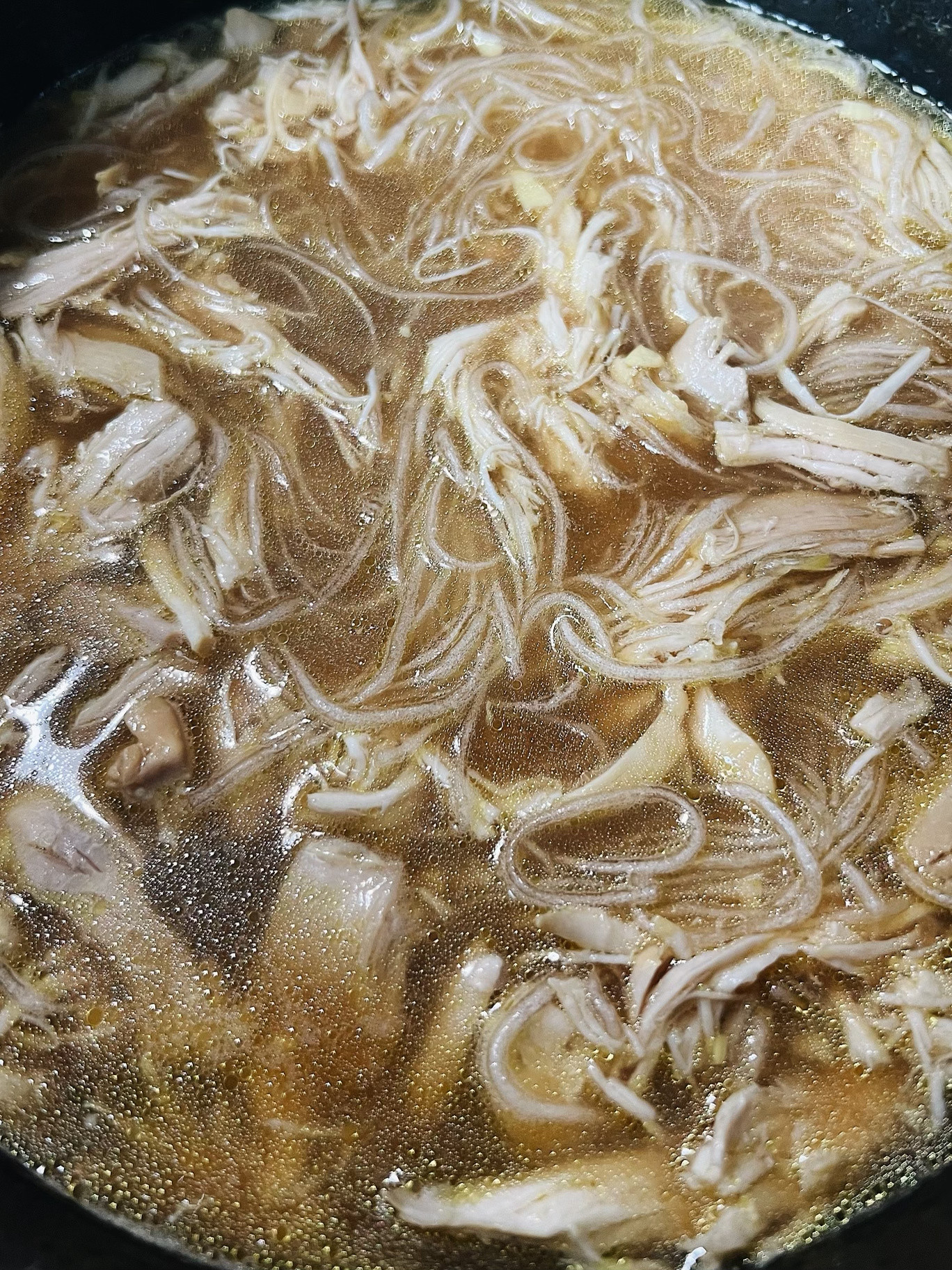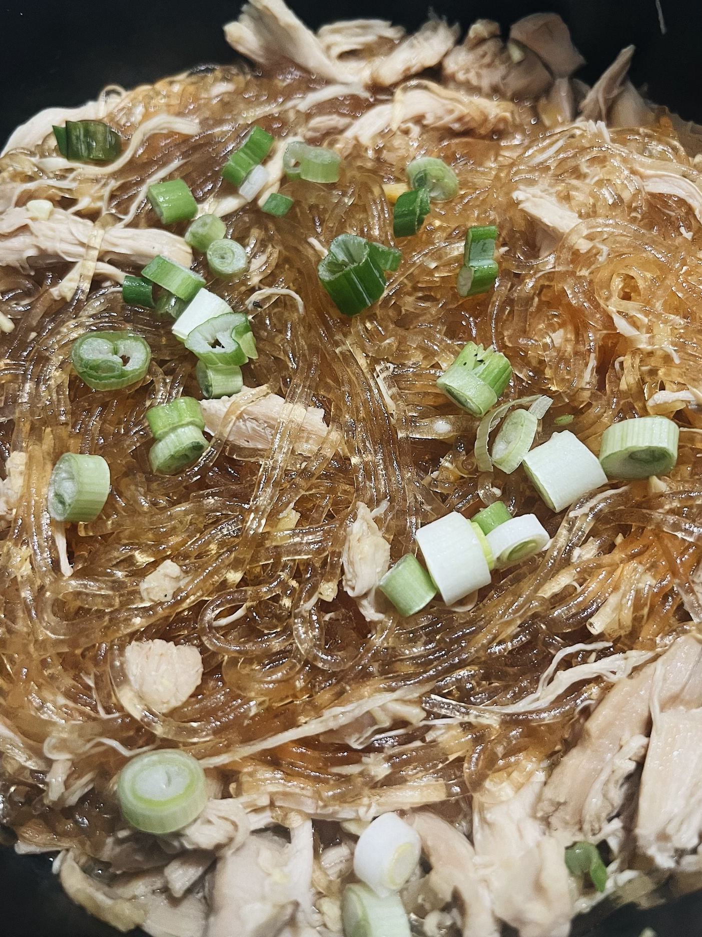 - Shred chicken then add cellphone noodles to stock, cover with lid, and simmer for another 7-10 minutes until the noodles are soft. Add more chicken broth if needed since the noodles will soak up most of the sauce. Garnish with green onions and enjoy!!