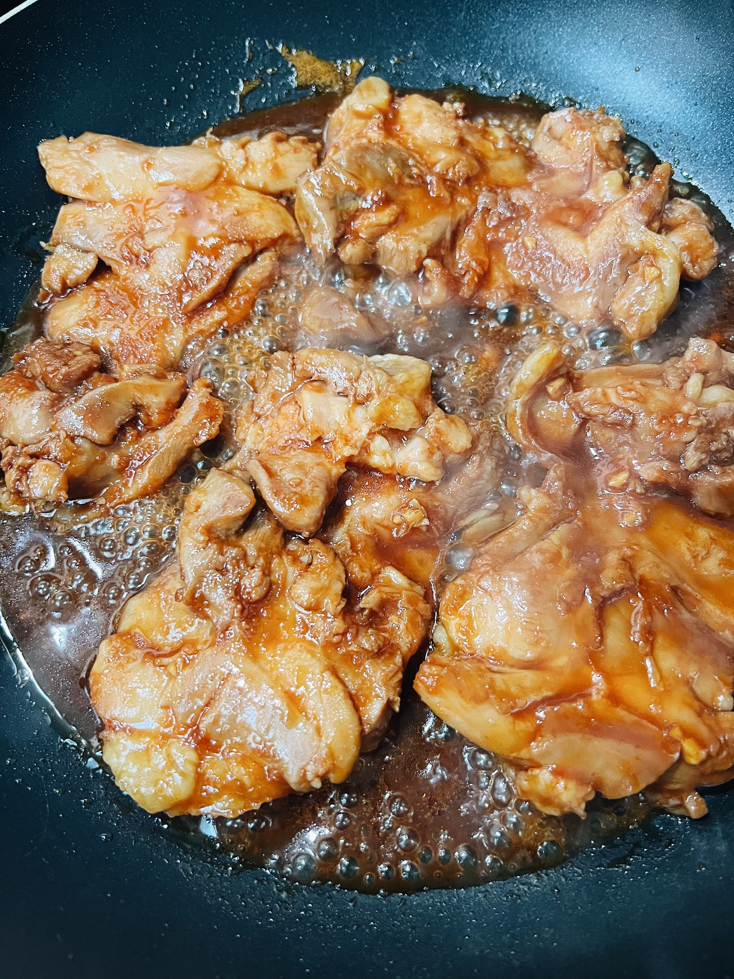 - Carefully place the marinated chicken pieces onto the skillet.
