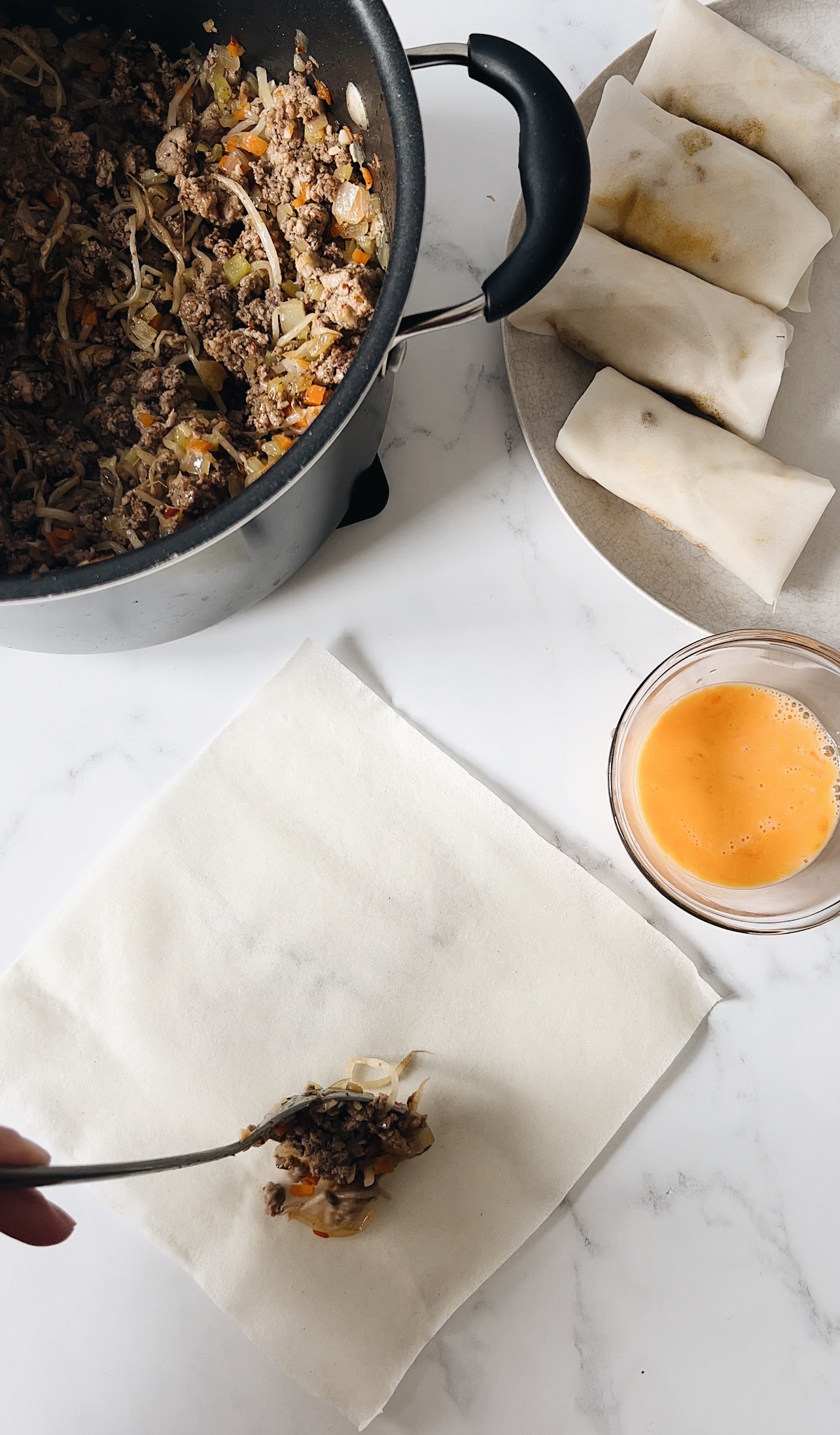 • Add in the chili oil, sesame oil, shoyu, and rice vinegar. Combine until well mixed and incorporated. Remove from heat at let cool. While cooling set up wrapping station. Whisk egg in small bowl and set aside. Separate all the lumpia wrappers from each other so its easily accessible.