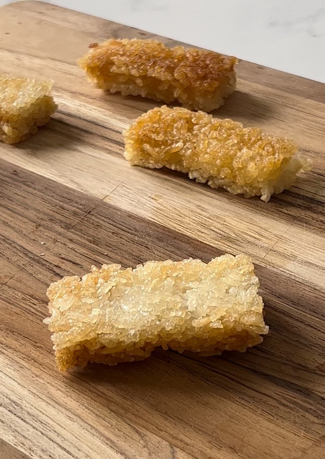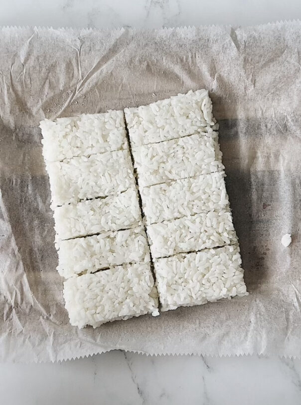 I removed them from the freezer after 30 minutes to an hour and trimmed the ends to ensure they were even. Then, I cut them into 10 pieces, but you can adjust the size based on your preference for each rectangle. Next, I heated a non-stick skillet with a shallow layer of hot oil. It’s important not to fill the pan with too much oil as the rice may break apart if deep-fried. Once cooked, I drained each piece on a paper towel to remove any excess oil.