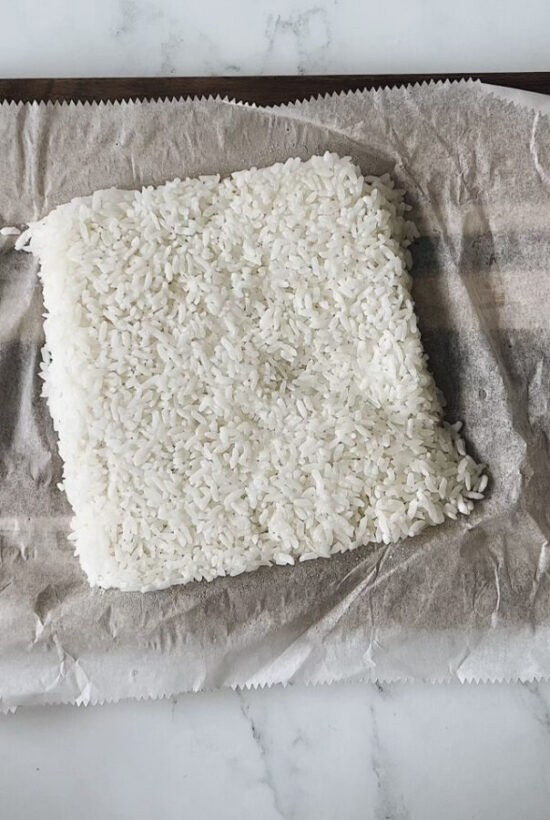 - Make sure you flatten the rice very tightly to ensure the rice stays together.