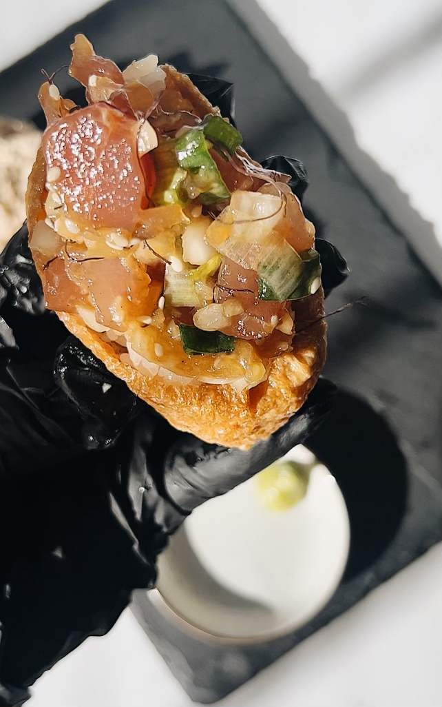 - Flatten the Bottom of the inari sushi so it stand up when you have the poke in it.