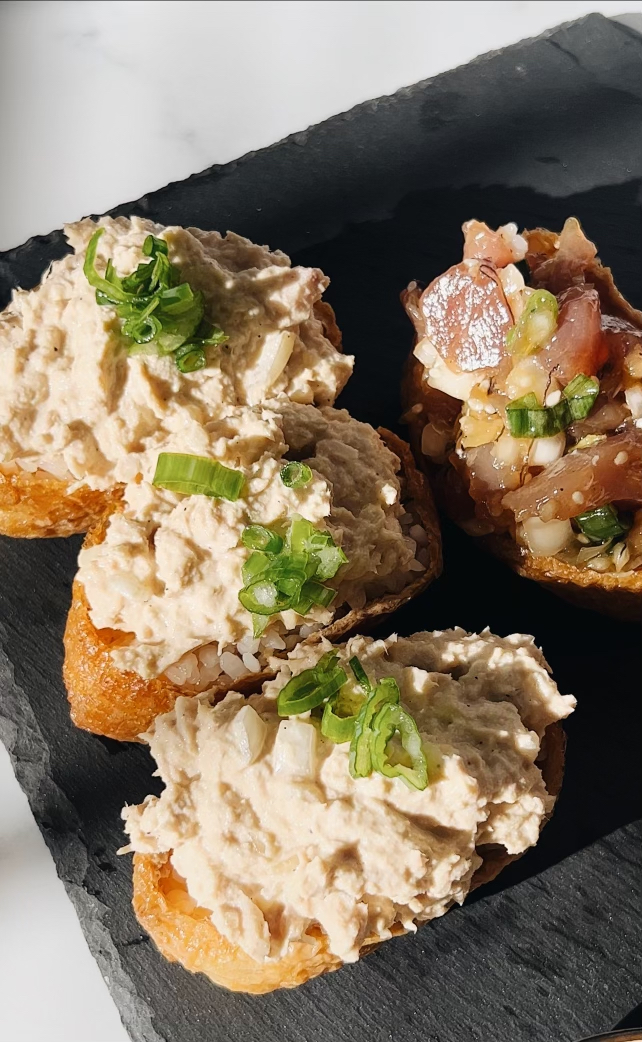 The easiest way to make it, is to buy already made inari sushi and just add your toppings to it. If you can’t do that, don’t worry! You’ll still be able to try these out. For this recipe we’re just doing the basics and using Tuna mayo, spicy ahi, and shoyu ahi since thats what’s typically found in Hawaii. Feel free to take this and make it your by testing out different toppings, sauces, and ingredients! Scroll down to the bottom for the exact measurements and instructions.
